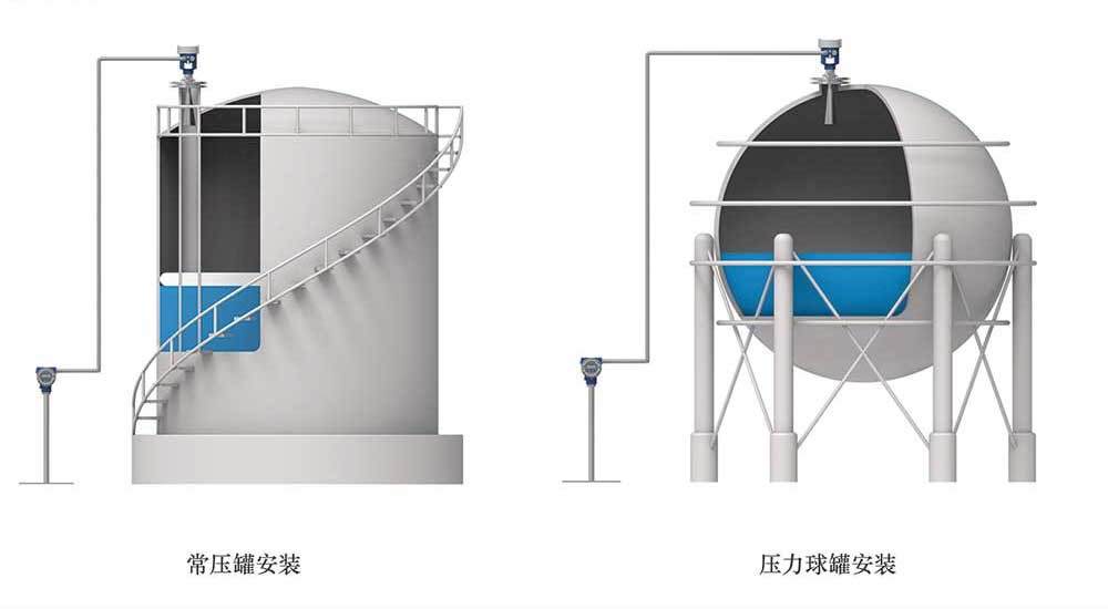 安裝要求:一般采用標準法蘭安裝到罐頂,也可采用旁通管安裝,導波管安裝等多種方式。高頻雷達放置在罐體直徑的1/4或1/6處,距罐壁不小于200mm,26G天線伸入到罐里至少10mm;測量錐形罐體,應安裝在錐形罐體平面的中間,保證可以測量到錐形頂部;測量有堆料的罐體,法蘭選型應選擇萬向法蘭(可調(diào)節(jié)方向)。